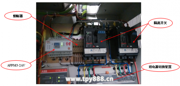 本商場綜合樓項(xiàng)目的AFPM3-2AV三相交流雙電源電壓傳感器安裝于斷路器或隔離開關(guān)的輸出端和雙電源切換裝置的輸入端之間,主電源電壓信號(hào)接1,2,3,4這四個(gè)端子,備用電源電壓信號(hào)接5,6,7,8這四個(gè)端子,以位于地下室區(qū)域的消火栓泵配電箱雙電壓監(jiān)控為例,傳感器AFPM3-2AV安裝位置示意圖如圖2所示,實(shí)物安裝位置圖如圖3所示,電壓信號(hào)接線示意圖如圖4所示。