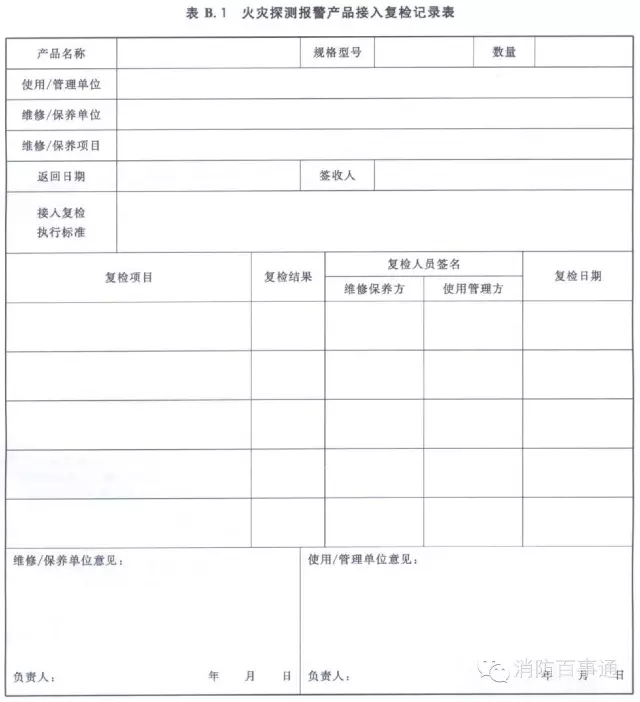 3.1.6承擔維修的企業應做好維修記錄,與產品使用或管理單位各執一份,并保存至該產品報廢。火災探測報警產品維修記錄表的格式參見附錄A。