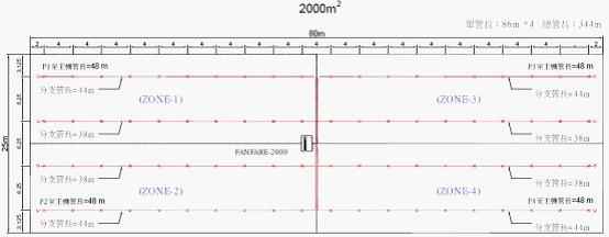 下圖是防火分區2000m2,使用FANFARE-2000探測主機,分為4個探測區域(每區500m2),采樣孔保護面積25.2m2的管路設計圖