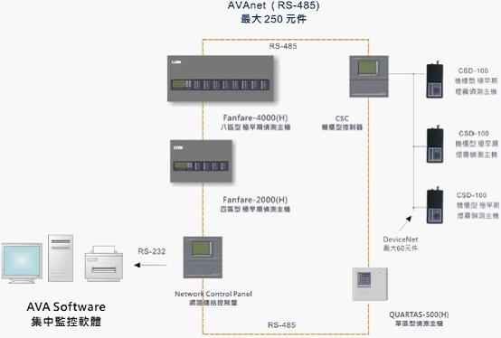 FANFARE-2000四區型極早期煙霧偵測主機,可以通過輸入模塊接入火災自動報警報警控制器;也可以全部聯網,并由AVA系統管理軟件對整個系統進行設置和監控。AVA系統管理軟件安裝在消防控制室的計算機上,用戶可以通過它對整個探測系統的所有性能進行設置、調試和監控。